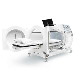 1.- DESCRIPTION DIMENSIONS AND VOLUMES 1.1 DESCRIPTION • The Hyperbaric Chamber MO-13 is a chamber of the monoplace type, designed for medical treatments (therapies) of hyperbaric oxygenation in controlled conditions, in an atmosphere of medical oxygen at pressures up to 3 ATA. • The Hyperbaric Chamber MO-13 is a pressure vessel made of special steel, with horizontal cylindrical structure, with transparent acrylic tube section of 1,300 mm long and 900 mm. diameter, made of one single piece without seams or glue that allows the patient full visibility to the outside, reducing the feeling of confinement and providing comfort for its interior space. • All the equipment, parts and pieces used in the manufacturing process are designated, certified and approved for its use especially in a hyperbaric atmosphere. • Upon request of the customer, this model can be made with pressurization system with compressed breathing air and oxygen supply by mask.